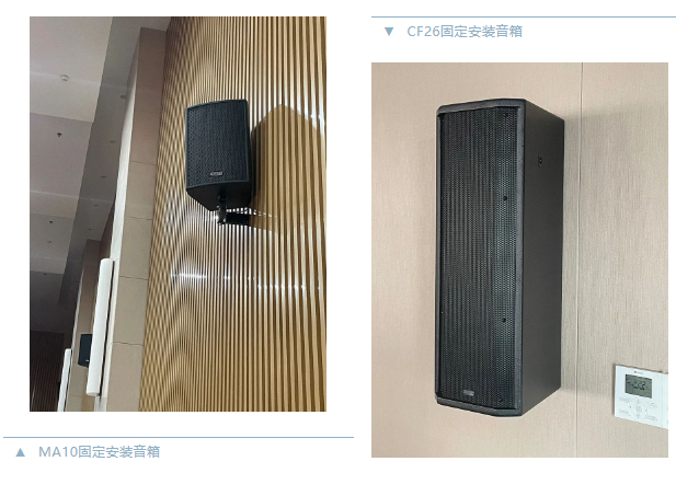 本次項目中兩間多功能報告廳,宴會廳的主擴聲系統均采用Mission Pro(英國美聲)MA系列音箱系統,新聞發布室、情景實訓室及9間教室,均采用CF系列固定安裝音箱系統,會議室采用CV6-16吸頂音箱,本次項目所有場景的驅動揚聲器系統皆采用MI系列數字功放。