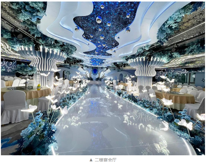 藝術宴會中心三樓宴會禮堂面積900㎡,層高6m且寬闊無柱式建筑設計,可容納500人,奢華的施華洛世奇水晶裝飾,猶如綴著無數(shù)顆寶石般的星辰,向賓客訴說著一種莫忘初衷,美好永存的美妙寓意。