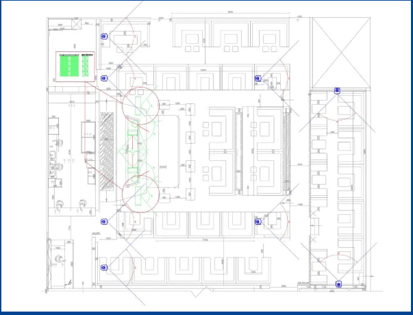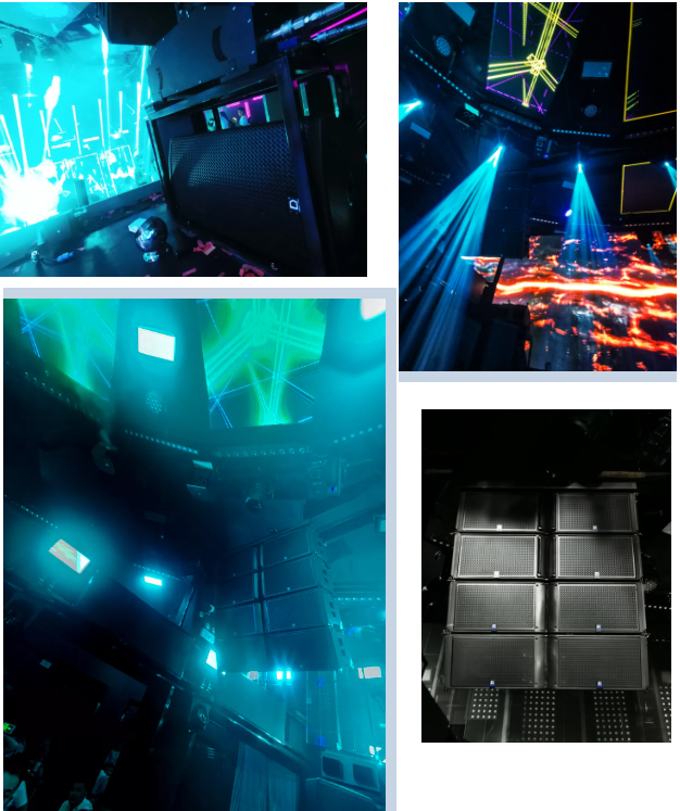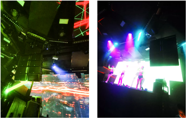 EV娛樂旗艦系列雙12寸三分頻線性陣列音箱搭配FX-2單12寸內置兩分頻音箱組成舞臺及中央區域擴聲。FX-4雙12寸內置兩分頻音箱確保后場直達聲充足且整個場地的聲場均勻。左右卡座實施點聲源補聲方案,由FX-3單15寸內置兩分頻音箱保證近場和遠場保持自然流暢的統一覆蓋。
