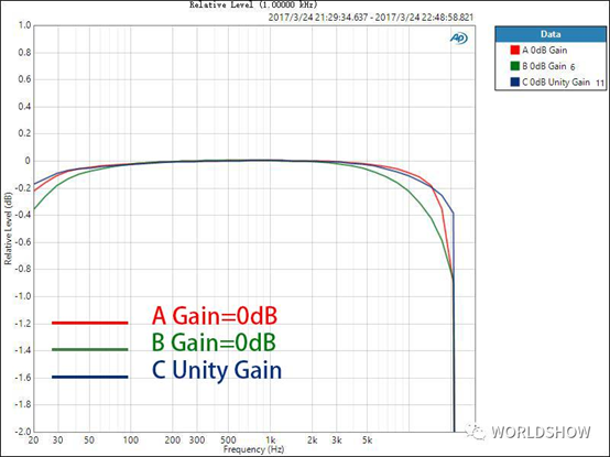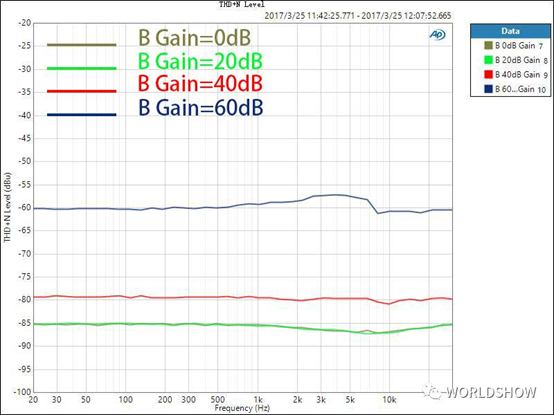 對(duì)于數(shù)字調(diào)音臺(tái),我們不僅要關(guān)心話(huà)放增益在0dB時(shí)的THD+N比率,還需要了解到,話(huà)放增益在不同位置時(shí)的情況,因?yàn)檫@是使用中的實(shí)際情形。話(huà)放的增益在不同大小時(shí),其引入的噪音和失真也是不同的,了解這一點(diǎn)對(duì)于用戶(hù)正確設(shè)置增益也很有參考意義。