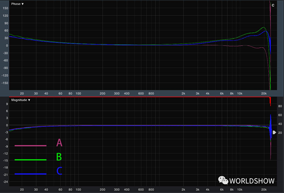 由圖可見(jiàn)三款產(chǎn)品的頻率響應(yīng)都能達(dá)到要求,幅頻響應(yīng)在±0.5dB之內(nèi),相頻響應(yīng)都在±30°之內(nèi),這其中還有一定的測(cè)量誤差。而三者之間的幅頻響應(yīng)差別還是顯而易見(jiàn)的,B型號(hào)的頻率響應(yīng)明顯比A和C差一些。