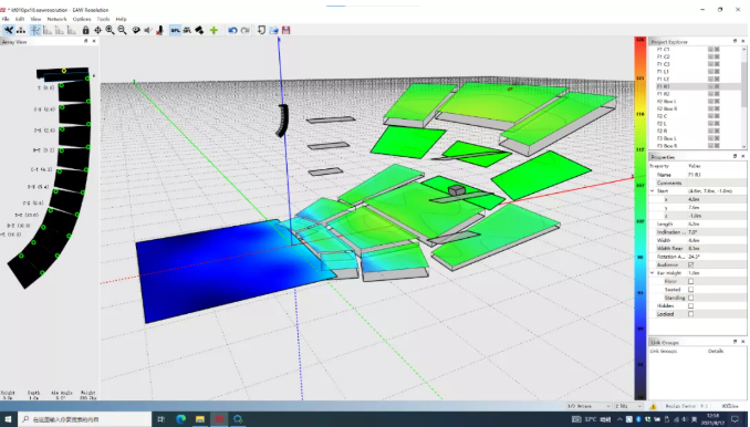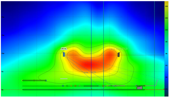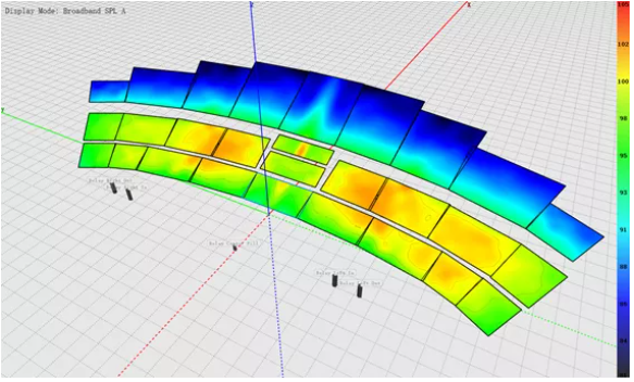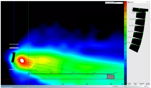 但在實(shí)際系統(tǒng)實(shí)施的過(guò)程中,吊掛高度很可能受限。因此第二張圖展示了同樣的陣列在吊掛高度為9米時(shí)的覆蓋情況,通過(guò)調(diào)整陣列物理姿態(tài)獲得了與第一張圖非常接近的覆蓋結(jié)果。
