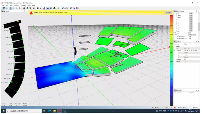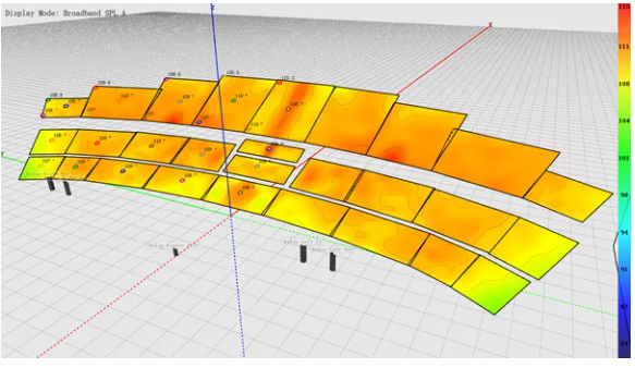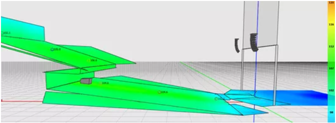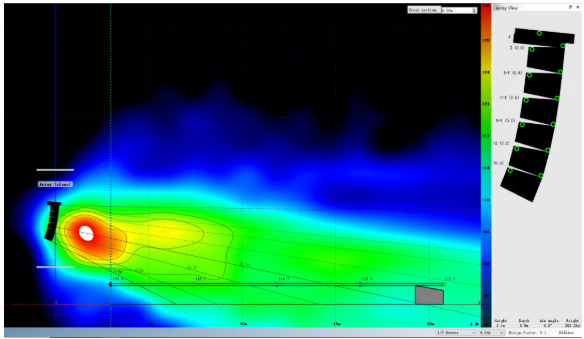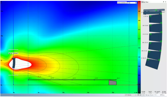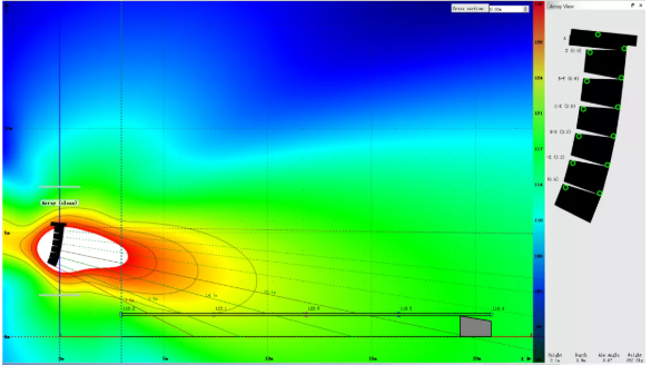 我們可以看到,為了獲得較為滿意的覆蓋結(jié)果,傳統(tǒng)線陣列在吊點(diǎn)高度不足時(shí)必須以接近極限的物理姿態(tài)來(lái)進(jìn)行安裝。請(qǐng)注意最上面2顆音箱的快插銷(xiāo)已經(jīng)出現(xiàn)了載荷警報(bào),呈現(xiàn)紅色。在實(shí)際項(xiàng)目中如果遇到此類(lèi)情況,就不得不在吊裝位置和覆蓋效果之間做出妥協(xié)。