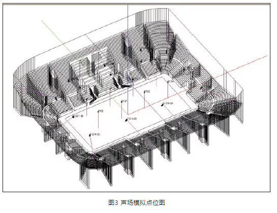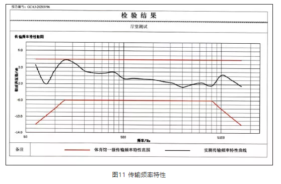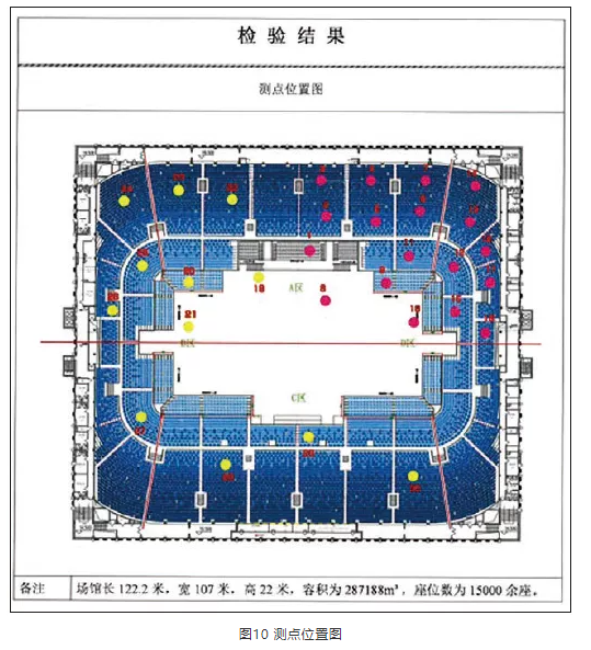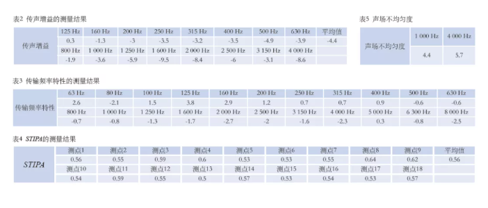 施工完畢后,進行了現(xiàn)場實測,測點如圖10所示。經(jīng)現(xiàn)場測試,擴聲系統(tǒng)聲壓級可基本達到設計值,其他測量結果見圖11、表2—表4。測試結果反映,該項目達到設計目標及行業(yè)相關標準指標。