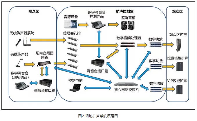 擴聲系統(tǒng)的總體改造方案,系統(tǒng)的音頻控制、傳輸通過Dante網(wǎng)絡構建數(shù)字加模擬的混合網(wǎng),場館內所有音頻信號均匯聚到音頻控制機房進行分發(fā)。數(shù)字調音臺同樣采用一主一備,主調音臺可搬至場內進行現(xiàn)場調控,并在主席臺區(qū)預留音頻接口箱,可接入有線傳聲器、無線傳聲器系統(tǒng)。系統(tǒng)使用時,需要根據(jù)不同賽事的使用場景對數(shù)字調音臺以及功率放大器進行預設。系統(tǒng)基本框架如圖2所示。
