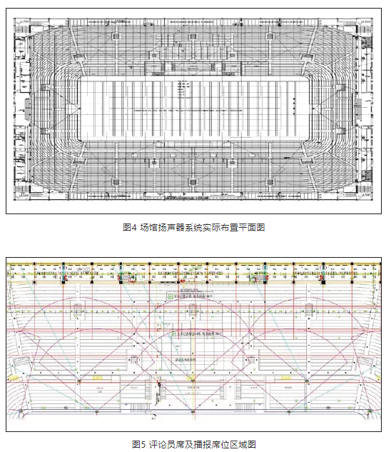 比賽場地上空設置有巨大的投影幕布,面積與比賽場地近乎一樣。為此,對場地擴聲系統(tǒng)提出了多種方案。其中,一種方案是調整揚聲器的覆蓋角度,以避免因投影幕布反射形成的回聲,但受整體環(huán)境所限,難以實現(xiàn)。另一種方案是考慮采用透聲幕布,揚聲器吊掛在透聲幕布上方,但會影響投影效果。在實施中,最初采用透聲幕布,經(jīng)過多方溝通,方案幾經(jīng)調整,在安裝位置與投影幕布之間取得平衡,最終采取分段式幕布加揚聲器吊掛調整,將揚聲器吊掛與各幕布之間,并選用8只小尺寸、高聲壓的點聲源揚聲器P12,既不會影響投影效果,也可滿足聲場覆蓋,達到設計指標。