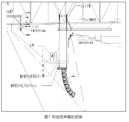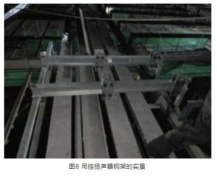 在揚聲器系統(tǒng)吊掛過程中,由于首都體育館保留了原有大頂球型網(wǎng)架結構、馬道,在球型網(wǎng)架的結構下還有鋁板造型結構以及龍骨,而揚聲器系統(tǒng)的吊掛點位于大廳頂層鋁板之上,需要穿過結構下懸桿、鋁板和鋁板固定龍骨層,避開燈光線路以及馬道,并且每一組線陣列揚聲器的安裝位置不相同,需要精確的定位,以滿足現(xiàn)場覆蓋的范圍及角度。基于這種情況,在進行了實地勘察測量后,經(jīng)各方討論,最后選擇了單獨設計安裝鋼結構吊點的吊掛方式。根據(jù)現(xiàn)場不同的位置,定制吊掛揚聲器的鋼架,如圖7、圖8、圖9所示,吊掛高度可以在鋼架上調整。這一結構不僅可以避開場地照明光路等,還可以應對施工過程中馬道等一些設施的更改。