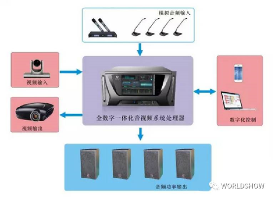第三代:純數(shù)字架構(gòu)。在第一代和第二代音頻架構(gòu)中一般都需要配置的調(diào)音臺(tái)的功效非常強(qiáng)大,有時(shí)甚至強(qiáng)大到非專業(yè)人士無法操作的“牽一發(fā)而動(dòng)全身”的境地。同時(shí),隨著社會(huì)化的發(fā)展,人力成本的提升,專門的“音響師”崗位無法滿足社會(huì)的需求。同時(shí),討論型會(huì)議室的大量出現(xiàn),調(diào)音臺(tái)的作用無法滿足其現(xiàn)場操作的需求。同時(shí),復(fù)雜的模擬連接方案也不適應(yīng)現(xiàn)在會(huì)議系統(tǒng)的需求。因此,出現(xiàn)了全數(shù)字架構(gòu)的音頻矩陣技術(shù)。從話筒輸入,到最后全部處理完成的音頻信號(hào)輸出,全部音頻信號(hào)的處理、復(fù)制、傳輸?shù)拳h(huán)節(jié)都在一臺(tái)或多臺(tái)數(shù)字設(shè)備的數(shù)字技術(shù)內(nèi)完成,僅有一次AD/DA轉(zhuǎn)換,因此稱之為第三代音頻架構(gòu):全數(shù)字化架構(gòu)。特別是全開放結(jié)構(gòu)的數(shù)字化產(chǎn)品,系統(tǒng)的核心價(jià)值已經(jīng)由完全的硬件采購部分轉(zhuǎn)移到了軟件拓?fù)涞亩伍_發(fā)上。編程開發(fā)人員的水平重要性已經(jīng)超越了設(shè)備的價(jià)值。當(dāng)然,所帶來的缺陷是現(xiàn)場操作的臨場手感沒有了。不過也不算可惜,現(xiàn)在的會(huì)議環(huán)境已經(jīng)不需要音響師現(xiàn)場調(diào)音了。