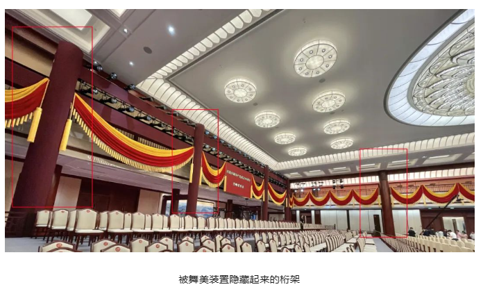 因廳內無吊點可用,上空中央有紅色五角星花燈,大廳四周用立柱分割出環廊,于是在舞臺區搭建了跨度達29 m的主結構架,用于固定舞美景片及吊掛燈具。舞臺背景使用紅色五角星的門頭造型,三重門柱依次向舞臺縱深排布,舞臺后端設置了P2高清LED屏幕。廳內兩側回廊前搭設一組細長的結構架,裝飾金色麥穗以及弧形布縵。在觀眾席的最后排位置搭建了一組高度9 m、跨度28 m的多立柱結構龍門架,同樣與舞美設計一并進行整體裝飾,把結構架隱密在現場環境中,使之在視覺形象上成為場地本身的一部分。
