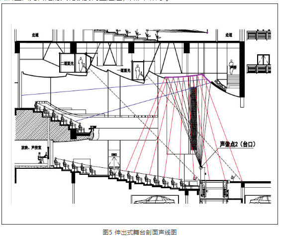 若將聲源位置按樂(lè)池作為伸出式舞臺(tái),移向升降臺(tái)口線上,按原聲源位置的體型設(shè)計(jì)會(huì)產(chǎn)生反射聲落在聲源附近并進(jìn)入舞臺(tái),在前區(qū)觀眾席會(huì)產(chǎn)生回聲等聲學(xué)缺陷。若要改善這一現(xiàn)象,從揚(yáng)聲器口后至面光口處的天花板要向上翹起,如圖5所示。