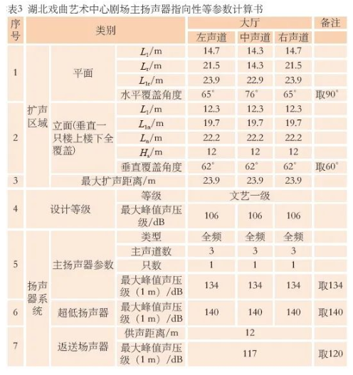 湖北戲曲藝術(shù)中心劇場(chǎng)擴(kuò)聲主揚(yáng)聲器聲線圖如圖7所示。依據(jù)上述理論設(shè)計(jì)揚(yáng)聲器系統(tǒng),計(jì)算過(guò)程及結(jié)果如表3所示,包括揚(yáng)聲器的垂直方向角、水平方向角和最大聲壓級(jí)等參數(shù)的選取。