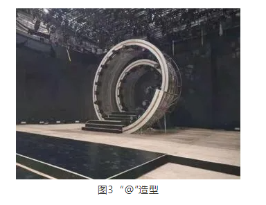 燈光設(shè)計(jì)既考慮整體協(xié)調(diào),又要獨(dú)立體現(xiàn)。主會(huì)場舞美設(shè)計(jì)為360°全景沉浸式舞臺(tái),在整體空間內(nèi)包含多個(gè)獨(dú)立空間。在不同空間內(nèi),通過多燈種、多方位、多結(jié)構(gòu)的組合布光方式,營造不同氛圍和環(huán)境光。舞臺(tái)表演區(qū)頂層由LED帕燈、染色燈、光束燈、圖案切割燈組成;舞臺(tái)正中的“@”圓形造型由光束燈、LED帕燈、LED變色燈帶組成(圖3);觀眾席兩側(cè)有“書房”“客廳”,用洗墻燈營造房間氛圍,沙發(fā)旁放上一盞落地?zé)糇鼍植空彰鳎块g頂上有一只吊燈做裝飾。錄制過程中,沒有互動(dòng)時(shí)都是剪影呈現(xiàn),觀眾席每一張圓桌正上方都有一只電腦燈進(jìn)行氛圍照明。