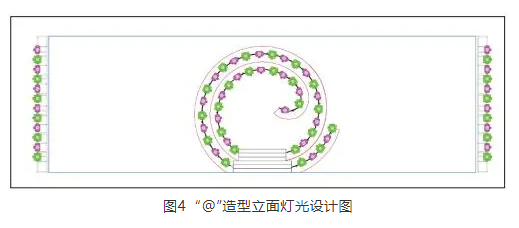 舞美造型“@”是舞美設(shè)計(jì)中特別重要的元素,當(dāng)一個(gè)超大“@”造型出現(xiàn)在舞臺(tái)上,壓縮了舞臺(tái)表演活動(dòng)空間,為燈光處理帶來難題。若需要大面積進(jìn)行照明,“@”造型會(huì)非常突兀地出現(xiàn)在鏡頭里,破壞舞美的空間層次。這時(shí),原本燈光設(shè)計(jì)的問題就凸顯出來,燈位角度過小,使得表演區(qū)人物下頜面部陰影比較長。在施工現(xiàn)場又增加了面光,通過多道面光組合及光比控制,保證人物及景區(qū)的正常曝光,體現(xiàn)空間的立體層次感(圖4)。在“@”圓環(huán)燈帶線條的基礎(chǔ)上,安裝小光束燈,在光結(jié)構(gòu)上形成點(diǎn)線的構(gòu)圖美感,使燈光效果達(dá)到虛擬與現(xiàn)實(shí)、過去與未來的連接,使觀眾感受到時(shí)空穿越。