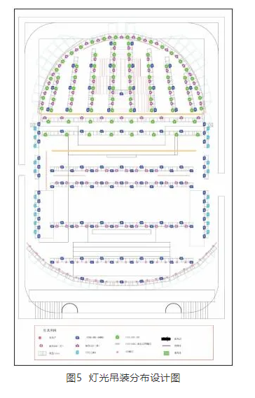 本次晚會(huì)節(jié)目均采用4K超高清攝像機(jī)錄制,畫面更加清晰,暗部細(xì)節(jié)更加豐富。為了更好地還原超高清電視畫面層次,根據(jù)空間的作用以及表演形式,在燈具選擇、照度以及布光角度等方面進(jìn)行反復(fù)推敲設(shè)計(jì)。在面光的選擇上,全部采用顯色指數(shù)90以上的光源,電腦切割燈作為晚會(huì)主光源,為保證錄制畫面一致性,每個(gè)表演區(qū)域照度在500 lx(±50 lx)且色溫為5 200 K(±100 K),光譜在可見光各個(gè)波長上的能量相對均勻。作為對表演區(qū)的燈光補(bǔ)充,在觀眾席后方設(shè)置4臺(tái)高顯色追光燈作為補(bǔ)充。攝像機(jī)光圈設(shè)定在4.0左右,在全局布光設(shè)計(jì)的基礎(chǔ)上,主舞臺(tái)和格子空間分別使用電腦切割燈精確切出光照范圍,在格子空間里面使用LED線條燈(washwall),營造色彩氛圍。觀眾席區(qū)域,每張圓桌正上方掛一個(gè)電腦切割燈,只對圓桌范圍進(jìn)行點(diǎn)光源布光,觀眾席后區(qū)使用LED帕燈進(jìn)行逆光渲染,并采用電腦切割燈做觀眾面光,確保每一個(gè)單獨(dú)的空間都有獨(dú)特的布光效果(圖5)。