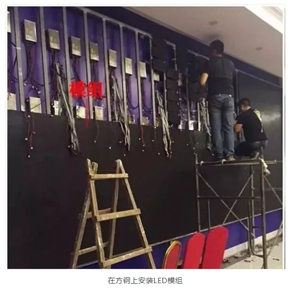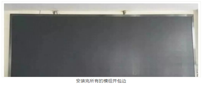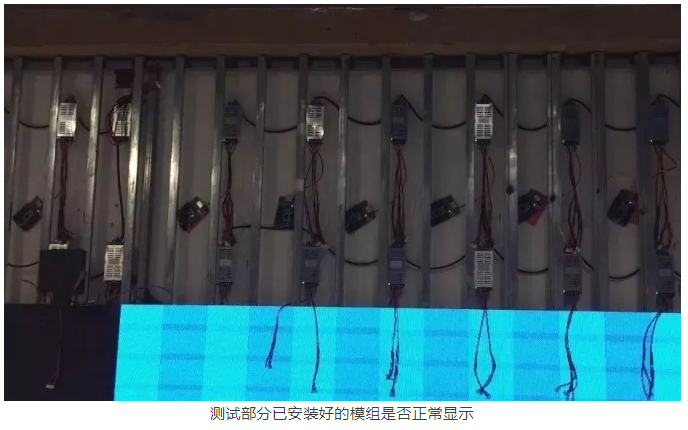 扣好不銹鋼邊后就能開紿上模組了。模組建議從下往上裝,從中間往兩邊開始安裝。這樣的安裝方式有很多爭議,從底部安裝主要是為了使水平和垂直都能在正??刂品秶鷥?,特別是屏幕的面積大了以后,更加容易失控,特別是小間距的要求超高,有點縫隙沒有達到要求,都需要做精細的調整。