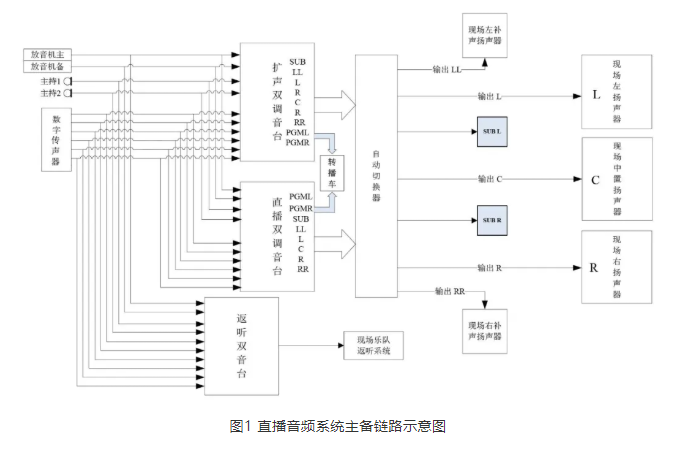 對于綜藝節(jié)目的音頻系統(tǒng),現(xiàn)場擴聲系統(tǒng)與播出系統(tǒng)的前級十分類似,主要涉及輸入信號和調(diào)音臺的備份,而現(xiàn)場擴聲系統(tǒng)在后級設備的備份上較為復雜,通常會將主備調(diào)音臺系統(tǒng)的輸出信號在功率放大器或揚聲器處進行切換。