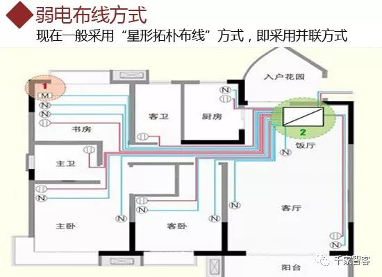 家庭弱電布線的絕大部分都是采用"星形拓樸布線"方式,即采用并聯(lián)方式,集中匯聚到弱電箱中實行集中管理。這是對過去"總線拓樸結構"的代替,并聯(lián)強調(diào)的是每條線路都是獨立的,能夠避免單點故障導致整個系統(tǒng)的癱瘓,也方便單條線路進行拓展。