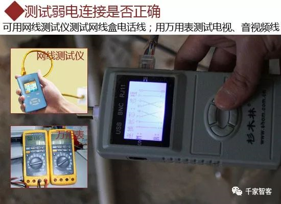 弱電驗收最重要的就是檢驗弱電連接是否正確,無斷路也無短路。網(wǎng)線和電話線測試的時候,需要用到網(wǎng)絡測試儀,根據(jù)儀器操作說明判斷線路是否連接正確;而有線電視線、音視頻線、音響線的測試需要用萬用表測試通斷;其他的弱電線路,則建議采用相應的專業(yè)儀表測試。