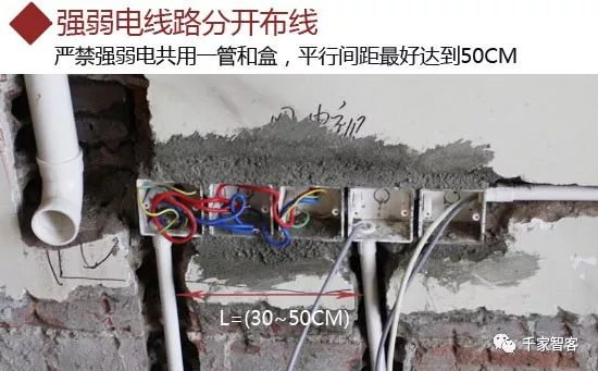 電路改造時一大禁忌,就是施工隊為了施工方便,將所有線路收納到一起。這樣做的后果是線路之間會受到干擾,導致信號不穩(wěn)定,而且還會留下火災隱患。因此在電路改造的時候,強弱電應該分開走線,嚴禁強弱電共用一管和一個底盒,強電線路平行間距不能低于30cm,最好是50cm,交叉必須成直角。
