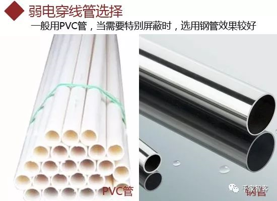 弱電所穿線管應采用鋼管或硬質(zhì)PVC管,PVC管價格相對便宜,比較常用,但是對信號屏蔽效果沒有銅管好。因此,如果所步線路存在局部干擾源,且不能滿足最小凈距離要求時,應該采用鋼管作為穿線管。