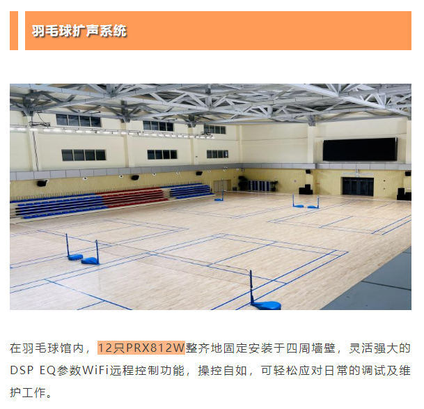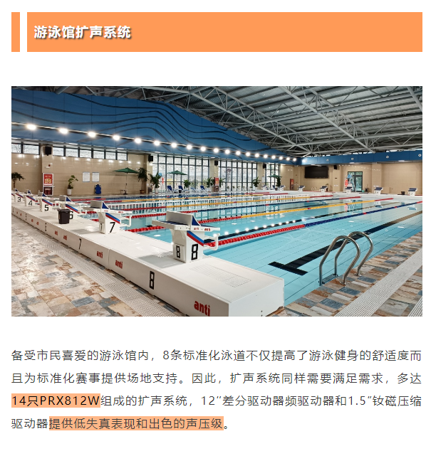 此次為城西區(qū)體育公園籃球館、羽毛球館和游泳館打造的擴聲系統(tǒng)全部采用美國JBL PRX800智能有源揚聲器系統(tǒng),更智能、更響亮、更穩(wěn)定的技術(shù)優(yōu)勢為市民的日常健身氛圍和重大賽事的舉辦提供高質(zhì)量支持。