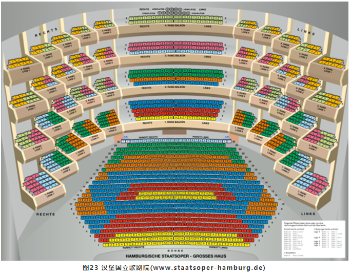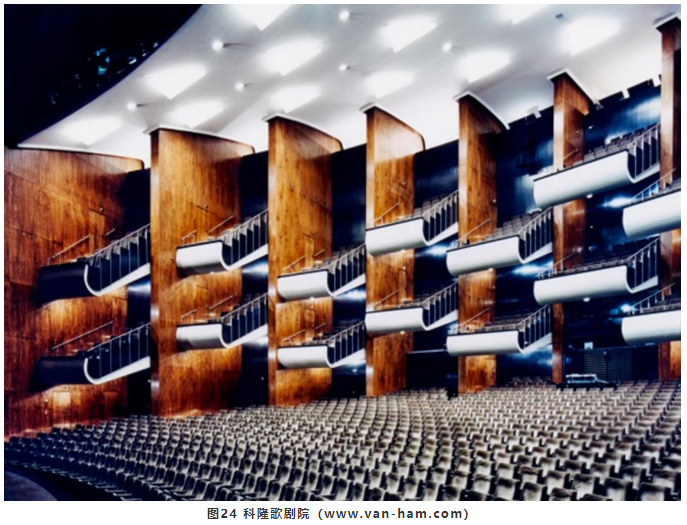 德國歌劇院曾經(jīng)在20世紀(jì)中期,嘗試改進(jìn)歌劇院側(cè)包廂視覺缺陷,將觀眾廳平面設(shè)計成六邊形,前半部分?jǐn)U大(增加容座、為側(cè)包廂騰出視角)、后半部分回收(取消邊角不利位置、為后部側(cè)包廂內(nèi)移提供墻體支撐)。側(cè)面的挑臺做成一個個略向前傾的雪橇形,層層跌落地朝向舞臺方向。這種“傾斜雪橇”的形式較好地解決了包廂的視線問題,但是觀眾廳前半部分的扇形特性直接導(dǎo)致池座的絕大部分區(qū)域缺少早期的側(cè)向反射聲。1955年重建的的Hamburg State Opera(漢堡國立歌劇院,見圖21、22)、1957年重建的科隆歌劇院(cologne opera,見圖23)和1961年重建的德國德意志歌劇院(Deutsche Oper,見圖24)都采取了“傾斜雪橇”的形式,但終因聲學(xué)上的缺陷而沒有在歐洲和世界上推廣開來。