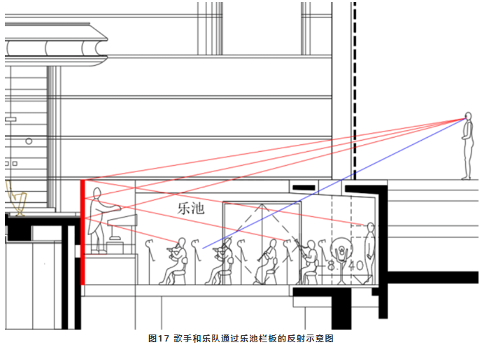 對于歌手而言,提供<35ms早期反射聲,只有舞臺上布景的反射以及臺口側(cè)墻(包括臺框和臺口側(cè)包廂或樓座欄板)的散射能夠做到。對于樂隊而言,下沉式樂池四周的墻面、懸挑的頂部以及池座上部的包廂欄板等都能提供充足的<35ms早期反射聲。
