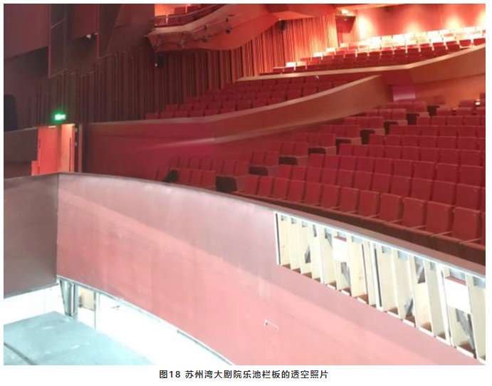 由于樂池的下沉,歌手和樂隊彼此之間大多數(shù)看不到對方,也就是說他們之間缺乏直達(dá)聲進(jìn)行交流,通過反射面提供<35ms的早期反射聲進(jìn)行交流就至關(guān)重要。樂池欄板是歌手和樂隊之間最近的反射面(見圖17),因此欄板必須是硬的反射面。蘇州灣大劇院樂池的右側(cè)欄板采用透空做法(見圖18),優(yōu)點(diǎn)是可以提高了樂隊的聲級特別是高頻聲,增加樂隊演奏聲的亮度。但是卻產(chǎn)生了三個不利因素:一是打破了歌手和樂隊之間的平衡,使樂隊聲能可能蓋過了歌手;二是減少了歌手和樂隊之間的早期反射聲交流,不利于演出的同步性;三是觀眾可以隱約看到樂譜燈光,干擾觀看演出。綜合考慮這種做法并不可取。