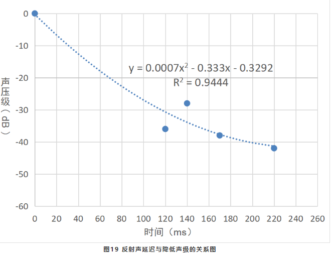 Nakamura等人(1991)[18]根據(jù)大量試驗(yàn)認(rèn)為:延遲時間為140ms的反射聲級應(yīng)比直達(dá)聲低25~30dB(均按歌唱歌手前1m處測得)。Okano(1994)[6]一組女高音歌唱歌手來做試驗(yàn),請她們判斷墻面反射來的容許聲級為多少。對于延遲時間為120、170和220ms的反射聲,最敏感的歌唱家認(rèn)為容許聲級在直達(dá)聲以下分別為36、38和42dB。根據(jù)這兩組數(shù)據(jù)繪制出反射聲延遲與降低聲級的關(guān)系圖18,可以看出不同的實(shí)驗(yàn)對容許聲級還是有一定差別,需要在實(shí)踐中,根據(jù)演出團(tuán)隊的需求進(jìn)行適當(dāng)?shù)卣{(diào)整。