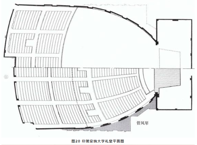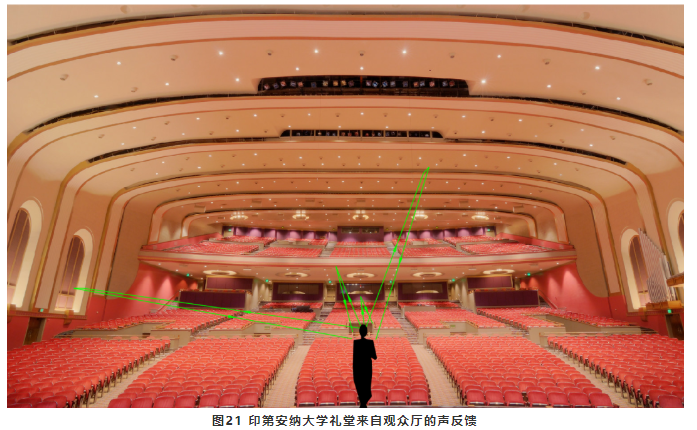 美國印第安納大學(xué)禮堂的平面圖見圖19,由于臺口側(cè)墻形狀呈內(nèi)凹形,前中區(qū)的大量觀眾席肯定缺少早期側(cè)向反射聲,因此觀眾廳的音質(zhì)效果并不太好。但是由于有來自池座后墻、挑臺欄板、側(cè)墻格柵邊緣以及頂棚上燈槽線腳的反射聲而產(chǎn)生出一種特殊的活躍感(見圖20)。歌手說禮堂對他們的歌聲有很好的支持;樂池中的指揮說整體感很好,樂隊也易控制。歌手和樂池中樂隊的平衡對大廳中大部分位置是滿意的。從印第安納大學(xué)禮堂的例子可以看出從表演者角度進(jìn)行聲學(xué)設(shè)計是多么重要。