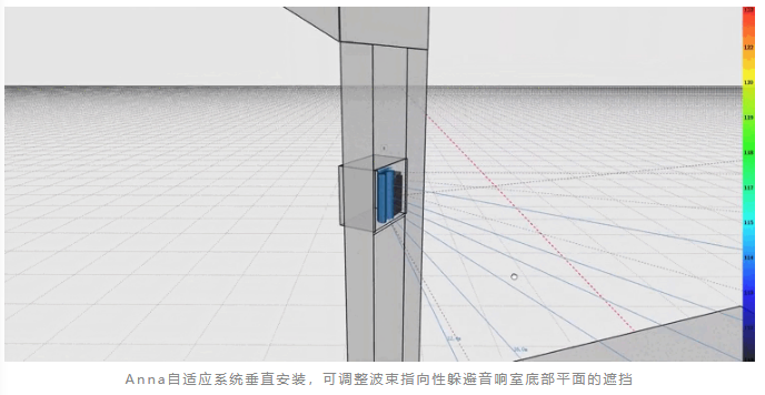 在暗裝的方式下音響室空間通常狹小緊湊。在本項目中,音響室的底部平面距離陣列僅10厘米。如果采用傳統線陣列的擴聲系統,陣列會形成J字型物理姿態,不僅占用較大的安裝空間,J型底部的音箱單元還有可能將聲能投射到音響室的底部平面上,導致大部分高頻能量無法穿透出來,從而無法覆蓋到一部分前區的觀眾區。選用Anna,它的垂直吊裝方式既能節約了安裝空間,還能將高中低頻單元統一的盡可能靠近透聲幕,躲避音響室底部平面對波束的遮擋,最終實現幾乎全場的覆蓋。