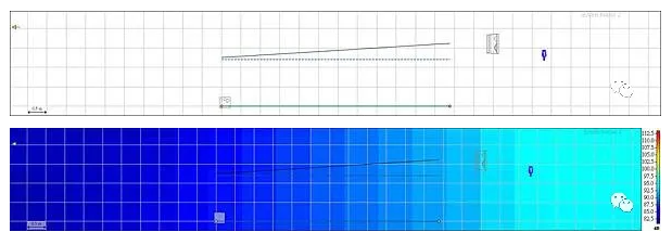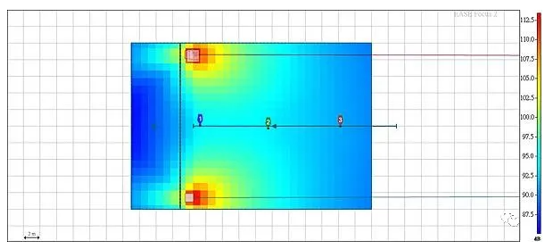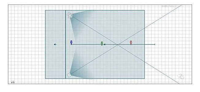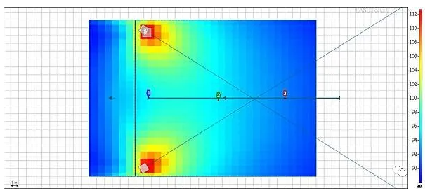 我們來看舞臺的音壓分布圖側視圖,toe in 前音箱后方舞臺的音量,每一方格0.5m